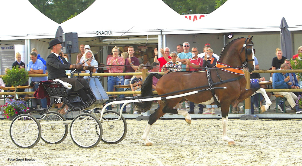 Op het altijd zeer goed georganiseerde concours hippique van Siegerswoude was ook het VERT-kampioenschap voor 6- en 7-jarige tuigpaarden. Acht deelnemers uit de verschillende regio’s bonden de strijd met elkaar aan waarna de beste vier echt om de titel gingen strijden. De altijd frank en vrij showende Icellie zoon Olympus HS van Handelshuis Schuttert ging voorop met Harry van Middelaar aan de leidsels en bleef voorop door heel overtuigend kampioen te worden. De 6-jarige KWPN-goedgekeurde hengst is op geen foutje te betrappen, heeft een heel mooi en verfijnd front en heeft zichtbaar plezier in zijn werk door constant de oortjes naar voren te hebben. De andere Olympus van Hans en Corrie Pos en voorgesteld door Marcel Ritsma was op voorhand de huizenhoge favoriet voor dit kampioenschap, maar kon zijn favorietenrol niet waarmaken en werd zelfs niet tweede. Die plek was voor Lieke Lueks met Neon GSM (v. Bocellie’s Matteo) van de combinatie Seinen/Lueks. Neon is ook een goedgekeurde hengst en groeide in de wedstrijd waarbij zijn gedragen show opvallend is. Vierde finalist was Niek Alting met de vrolijke vos Nolan (v. Hertog Jan) waarvan Cees van Dijk mede-eigenaar is. Nolan pakte veel bodem en werd vierde. Voor de jury was Olympus HS de onbetwiste kampioen. Bron: De Paardenkrant.