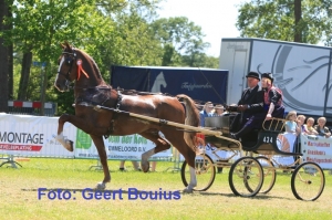 07-06-2015 | Waar Pluvius vrijdagavond nog behoorlijk van zich deed spreken in grote delen van Nederland met een aantal fikse onweersbuien en veel regen, had het nieuwe concours terrein van Rouveen er geen hinder van ondervonden en kon vandaag, zaterdag 6 juni, een prachtig spring- en tuigpaarden concours gehouden worden. Met de zon hoog aan de hemel trapten de tuigpaarden af met een lage limietklasse. Van de negen deelnemers kregen er zes een herkansing en werd de voorlopige plaatsing behoorlijk door elkaar gehusseld in deze lastig te jureren rubriek. Winnaar werd uiteindelijk Henk Hammers met de fraai gelijnde Giantha van Wout Liezen, die wel even tijd nodig had om de juiste cadans te vinden. Michel Verwoolde was met Focus van Anton Kogelman de voorlopige eerste en bleef goed constant bewegen, echter in het front mist de vos wat oprichting en werd nu tweede voor Berry van de Genugten met de mooie Edelroos van A. Bastiaanse. Ids Hoving en Brunette A begonnen sterk aan de wedstrijd, waarbij de voorhand en het front opvallend zijn, echter in de achterhand ontbeerd de bruine kracht en zakte een plekje naar vier. Met Erasmus klom Han de Boer van zes en naar vijf en Jan Veldhuis en Arana zakte van vijf naar zes. De tussen limiet was met veertien paarden de grootste rubriek en nadat de jury een kopgroep van zes had gevormd, wilden ze ook nog een tussen groepje zien, waaruit Leendert Veerman met Frydom van Harry van Dijk naar de kopgroep mocht. De finale kende veel kwaliteit met op kop Freek Saris en de machtig en ruim bewegende Fidrose van J.H. Gast. De grote merrie bleef……