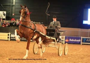 04-03-2016 | De hoofdring van de evenementenhal in Hardenberg waar vanaf 26 februari tot en met 5 maart PAARD 2016 wordt gehouden, was gisteravond 2 maart tijdens de Tuigpaarden avond afgeladen vol. De organisatie had er dus goed aangedaan om de tuigpaarden, en ook hackney’s, weer een prominente rol in hun programma te geven. In zes rubrieken kwamen de tuigpaarden zich aan het massaal aanwezige publiek voorstellen dat enthousiast meeleefde. In de kleine limietklasse reden Niek Alting met Gentleman en Antoon Epskamp met Grandioos de finale en kreeg in eerst genoemde de terechte winnaar. Gentleman beweegt vooral in de voorhand spectaculair en bleef heel constant presteren in een mooie houding. Grandioos heeft van nature veel front en ging ook goed maar zijn tempo werd gedurende de finale iets te hoog waardoor hij zijn passen niet meer goed kon afmaken. Met de grote Ewout BFT werd Brian Franken keurig derde voor Nico Calis met de bij tijden geweldig bewegende Emaire van Kramer. Mart Helmus sloot de rij in de openingsrubriek met Flexibel van Hans Robben. De grote limiet kende drie overrijders met op kop Marcel Ritsma met voormalig dekhengst Aron van alweer Hans Robben, die flink geïnvesteerd heeft voor komend seizoen. Aron klapte er vanaf het begin geweldig op en ging bijzonder ruim en krachtig door de baan. De winst was overduidelijk, hoewel Johan Borkent met Addink HBC Twenthe III van de combinatie F.E. en J. Borkent goed tegenstand bood. De zwarte gaat voor hoog en zet de voorbenen ver weg, maar was minder constant dan Aron. Met Bacardi, die eerder onder de naam Bavario op de concoursvelden te zien, werd met zijn nieuwe eigenaar Nico Calis derde. Zonder overrijden kon Rony Beuving Cetrienes als vierde opstellen en werd Gerard van der Meulen met Zo Wat van Joop Witlox vijfde. In de ereklasse zette Evelien Corbeek haar overwinningen reeks van 2016 voort met Only the Lonely, die nu ook krachtig en met machtige passen rond ging. Hij moest het in de finale wel opnemen tegen Nico Calis met Cognac en Nathalie Buwalda met Like to Win van stal Haak. De lichte vos van Nathalie had veel fans langs de kant en groeide in de wedstrijd wat resulteerde in een tweede plaats voor Nico. Met Wapenaar werd Gerard van der Meulen vierde en Jan van de Vegt sloot de rij met Atillos. De damesklasse bleek heel spannend toen Nathalie Buwalda met Like to Win als eerste werd binnen geroepen na de eerste omloop en het daarna in een tweestrijd moest opnemen tegen Evelien en Only the Lonely. Like to Win ging sterk over de benen maar mistte iets oprichting in het front en kon daarmee niet op tegen de grote, met de hals er hoog op, Only the Lonely. De donkere vos heeft voor de tweewielige dameskar toch ook meer uitstraling dan Like to Win voor de vierwieler. Els Nijenhuis reed een nu ruimer bewegende Cetrienes naar plaats drie voor Annemieke Calis met Cognac en Karlien Huisman met Ewout BFT. De drie tweespannen werden in één keer geplaatst en het was Nico Calis die uitermate blij was met de winst van zijn Cognac en Bacardi. Gerard van der Meulen werd tweede met Zo Wat en Wapenaar. Met zijn nieuwe span Cetrienes en Contant eindigde Rony Beuving als derde. De laatste rubriek, tuigpaarden gereden onder het zadel, kreeg een hele interessante climax omdat Susan Bouwman op haar Fries Minne van de Egberdina Hoeve moest overrijden tegen Evelien Corbeek op Only the Lonely. Twee top amazones op twee ervaren paarden die alles gaven. Na lang beraad kozen beide eenmansjuryleden Gerard Lokhorst en Jos Oude Lenferink toch voor Only the Lonely, waarmee Evelien net als afgelopen zaterdag avond in Nijkerk, wederom een hattrick scoorde. Op Cetrienes werd Els Nijenhuis derde en voor Marit Stellaard op Grandioos van Epskamp van plaats vier.