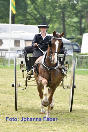 29-05-2016 | Tijdens ‘het Middenveld’ 2016 in het Drentse Steenbergen was het Harm Jan Veenstra die driemaal een ereronde mocht aanvoeren. Dit begon in de lage limiet alwaar hij met Grenadier (v. Atleet) al heel sterk het concours opende. “Daar loopt echt een tuigpaard” zei de jury. Grenadier toonde zich met veel front en kwam er goed van de vloer. De prestaties van de als tweede geplaatste Grandioos (v. Manno) met Robin Hoorn waren zeker ook noemenswaardig. Toch was de Manno-nazaat nog iets vlug in ritme. Peter Stevens mocht met Glamorous Wish (v. Bakboord HBC) ook mee overrijden in deze lage limiet maar kon Grenadier en Grandioos nog niet evenaren. In de hoge limiet ontpopte zich een fraaie strijd tussen voornamelijk Wim Cazemier met Fuwandra (v. Atleet) en Harm Jan Veenstra met Etiena (v. Morocco Field Marshal). Fuwandra liep het minst gedwongen en scoorde daarmee hoge ogen. Ook waren haar bewegingen mooi vierkant maar was het voorbeengebruik iets te vlug en bleek de iets meer tuigtypische houding van Etiena meer voorkeur van de jury te krijgen. Alweer een oranje rozet voor Veenstra. Een mooie strijd werd ook gevoerd door Fokkelien Oldeburger met Evert V. (v. Stjerreljocht surprise) en Grietje Naber-Dijks met Evita. Ze bevochten de derde en vierde plek waarbij Evert mooi tuigtypisch is en een derde plaats pakte waarbij Evita nog iets meer mocht rijzen.