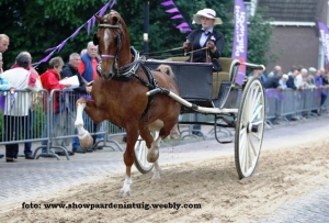 Uitgedost in voornamelijk kledij met paarse tinten kwamen om half zeven de eerste vier deelnemers met hun ook paars ingevlochten tuigpaarden de Westerstraat op draven. De heren Reinder Auwema en Egbert de Rink waren het jury koppel en plaatsten Nathalie Buwalda met de best dravende Vayacondios van stal Haak op de eerste plaats. Met Favoriet werd Aaldert Berghuis tweede, gevolgd door Bas Haak met Fantasy en Berend Huisman met Francis. Van de vier ereklasse paarden waren met name Like to Win met opnieuw Nathalie Buwalda, en Atillos van en met Jan van der Vegt, zeer aan elkaar gewaagd. Waar Like to Win sterker over de benen ging, liep Atillos meer verheven in het front. De winst ging naar de ruim bewegende lichte vos Like to Win. De merrie Ashja werd in handen van zijn eigenaar Albert ten Berge derde en Klaas Bosma kon met Wonder van de Ursahof als vierde aansluiten. Ook in de damesklasse voor de tweewielige waren Nathalie en Like to Win de te kloppen combinatie, echter dat lukte niet en dus werd ook deze rubriek winnend afgesloten door de jonge moeder uit Ter Apel. Een mooi succes na een kleine teleurstelling eerder op de dag in Odoorn, waar dezelfde combinatie niet mee mocht in de ereklasse finale. Als afsluiter van deze zeer druk bezochte gezellige avond kwamen de tuigpaarden onder het zadel nog voorbij en dit werd een tweestrijd tussen twee plaatselijke favorieten te weten Barbara Schriel op Bon Jovi van Berghuis en Nathalie Bos op Wonder van de Ursahof. Hoewel het publiek op de hand van Margreet was, liet de jury zich daardoor niet beïnvloeden en koos terecht voor Barbara, die Bon Jovi keurig voorstelde en de vos met veel afdruk en front reed. Na afloop was het nog lang gezellig in Ruinen!
