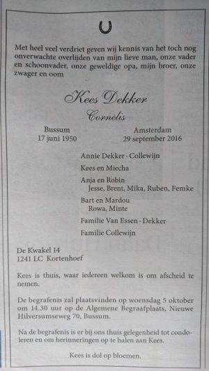 Overlijden Dhr. Kees Dekker