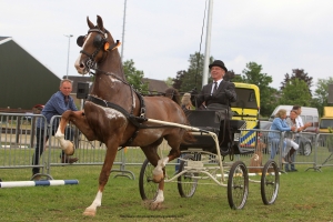 21-06-2017 | Op de laatste dag van het concours hippique van Nieuwleusen, zaterdag 17 juni, zijn de tuigpaarden ook altijd van de partij. Om 15.00 uur kwamen zeven limietpaarden in de baan voor hun wedstrijd en na overrijden met drie ging de winst definitief naar Wim Jansen met Cinuwalda (v.Larix). harry van Middelaar klom met Happiness-Lein (v.Manno) van de Zilfia’s Hoeve naar plek twee en verdreef daarmee Henk Hammers met Havana (v.Bentley VDL) van de familie Mekkes naar plaats drie. In de grote limietklasse duelleerden twee hengsten van Jaap van der Meulen om de hoogste eer en die ging met glans naar Lambertus Huckriede met Bommelsteyn’s Hubert (v.Cizandro) voor Henk Hammers met Heliotroop VDM (v.Colonist). De derde competitiewedstrijd voor regio Midden ging deze keer naar Anton Kogelman met de bijzonder deftig optredende India (v. Cizandro). De vos maakte zich groot, had een geweldig sterk achterbeen gebruik en wapperde de voorbenen hoog en ver weg. Tweede werd Cor van Dijk met Helandro B (v. Cizandro) en voor Lambertus Huckriede was de derde plek met Imondro (v.Cizandro) van Alfons Engbers. Met Imposant (v.Eebert) van Kees van de Maat werd Harry van Middelaar vierde. De ereklasse was de grootste rubriek van de dag en kende zoveel kwaliteit dat er eerst een tussengroepje over reed om de kopgroep compleet te maken. Het was Jan Westenberg met Any Time (v.Patijn) die naar de kopgroep mocht en daarmee zes deelnemers kreeg voor de finale. Hierin pakte Harry van Middelaar met de in de in deze klasse debuterende Master Den Roos (v. Tendens HBC) op grootse wijze de koppositie. De vosmerrie walste geheel los door het lichaam door de baan en deed met veel afdruk en ruimte in haar bewegingen. Hier kon Henk Hammers met Dendrini (v. Manno) van M.Kooyman niet tegenop en moest genoegen nemen met plaats twee voor Cor van Dijk met Elegant. John Docnk werd vierde met Zilver D (v.Ganges) en Jan Westenberg steeg door naar plek vijf met Any Time. Dries van Beekhuizen zakte naar de zesde plek met Wild Rose F (v.Manno). Bij de tweespannen moest de arbiter de beslissing nemen. Het ging tussen het ervaren span PrimeVal Wizz kids Gonda (v.Patijn) en – Varanno (v.Manno) met Derk Jan Mekkes en het nieuwe span Bommelsteyn’s Hubert en Imondro met Lambertus Huckriede. De bruinen liepen voor het eerst naast elkaar en klapten er geweldig op met veel actie en werden dan ook als winnaars aangewezen. Het span van Mekkes was over de benen de mindere van de winnaars maar waren in het front ook heel gelijk en mooi. Wim Jansen mocjt ook mee overrijden en werd derde met Gerran (v. Atleet) en Cinuwalda). In de rubriek tuigpaarden gereden door dames greep Hanneke Mekkes de macht met een bijzonder fraaie Bentley VDL. De vosruin bleef er hoog overheen kijken en ging ruim en tactvol over de benen. De jury was er dan ook in een keer uit en plaatste Fera Lueks op plaats twee met Ditisem (v.Roy M) voor Hanneke van Wessel met Briljant (v.Larix).
