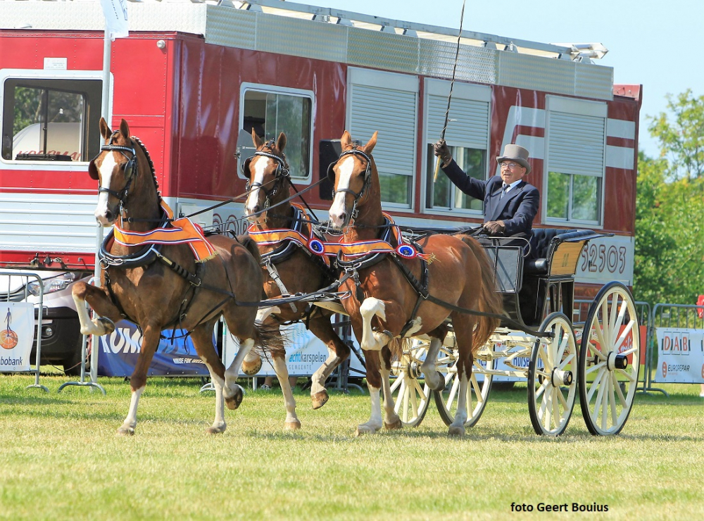 De drie vossen van Martien Verboord toonden veel gelijkheid in aftekeningen en waren ook in beweging een eenheid. Zowel de eerste omloop als de finale waren Eribo (v. Manno), Jonkheer (v. Eebert) en voorpaard El Nino (v. Atleet0 het beste voorwaarts en gaven de mooiste show. Leendert Veerman had de ervaren Eribo beschikbaar gesteld aan Verboord en dat paste perfect. Voorpaard El Nino stal de show als voorpaard en het was dan ook terecht dat de rijder uit Vlijmen werd uitgeroepen tot kampioen. Het was 30 jaar geleden dat hij met een klavertje- 3 aanspanning had gereden, maar het kostte geen moeite zo te zien.