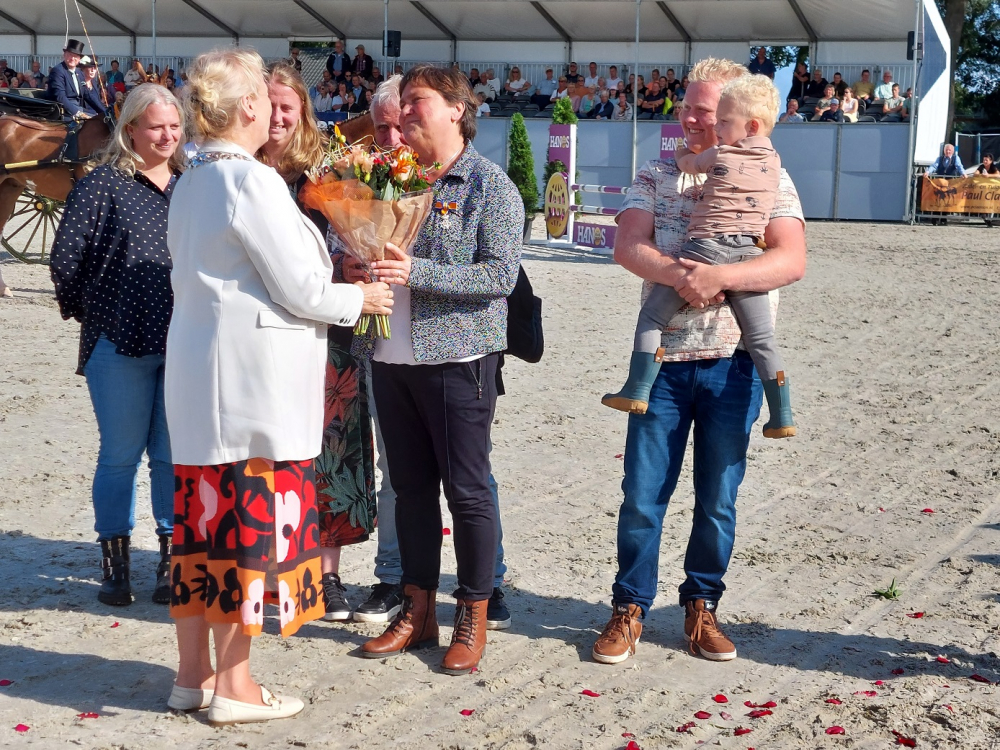 Nadat een diversiteit aan aanspanningen, allemaal getooid met een oranje sjerp om de nek, was opgesteld kwam als laatste Derk Jan Mekkes met zijn vierspan binnenrijden met in de koets burgemeester Inge Nieuwenhuis van de Gemeente De Wolden, waaronder ook Zuidwolde valt. Aangezien Henriette de burgemeester niet kent, had ze nog niets in gaten totdat haar man en kinderen en kleinzoon ineens aan kwamen lopen. Burgemeester Nieuwenhuis had zich goed voorbereidt en loofde inzet en passie waarmee Henriette al 25 jaar het wedstrijdsecretariaat van de VERT bestierd en zoveel meer regelt voor de rijders en de concours uitschrijvende organisaties.