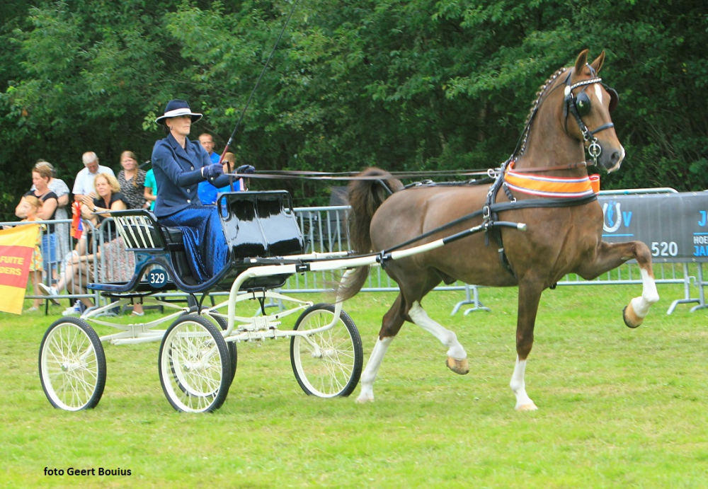 De helft van de combinaties kreeg een herkansing met Margriet van Asselt en Gerran van de familie Pos op kop. De sterke Grandioos (v. Atleet) gereden door Marit Westerink volgde, daarna Joelle Berghuis, die een thuiswedstrijd reed, met Mary-Rose MJDB (v. Delviro HBC) van Maarten Joris de Boer, Danielle Klinkhamer met Nationaal (v. Image HBC) en Pien Jansen met Joker (v. Delviro HBC) van de combinatie Jansen/Oosterlaar. Voor Danielle en Nationaal werd de spanning waarschijnlijk iets teveel want de fraaie vos kam niet meer in balans en eindigde als vijfde. Ook voor Joker, die na maanden blessureleed voor het eerst weer op concours was, duurde de wedstrijd te lang. De zwarte merrie kon niks extra’s meer brengen en werd vierde. Joelle had haar donkerbruine Mary-Rose goed voorbereidt op het kampioenschap want de merrie ging ruim en met een lang zweefmoment door de baan. De achterhand mag krachtiger ondergebracht worden, maar het was voldoende voor het brons. Het zilver was voor Marit en Grandioos. Krachtpatser Grandioos had de vorm van de dag want hij was ook al tweede geworden in de openklasse en ook onder het zadel werd deze plek behaald. De grote vos heeft een mooi natuurlijk front en straalt kracht uit. Voor de winst had hij iets meer bergop moeten lopen. Bij Gerran klopt eigenlijk alles. De door J. Bovendorp uit Oldebroek gefokte donkere vos gaat zuiver vierkant en foutloos over de benen en heeft een vriendelijke uitstraling door zijn mooi hoofd en orenspel. Een rechte kampioen.