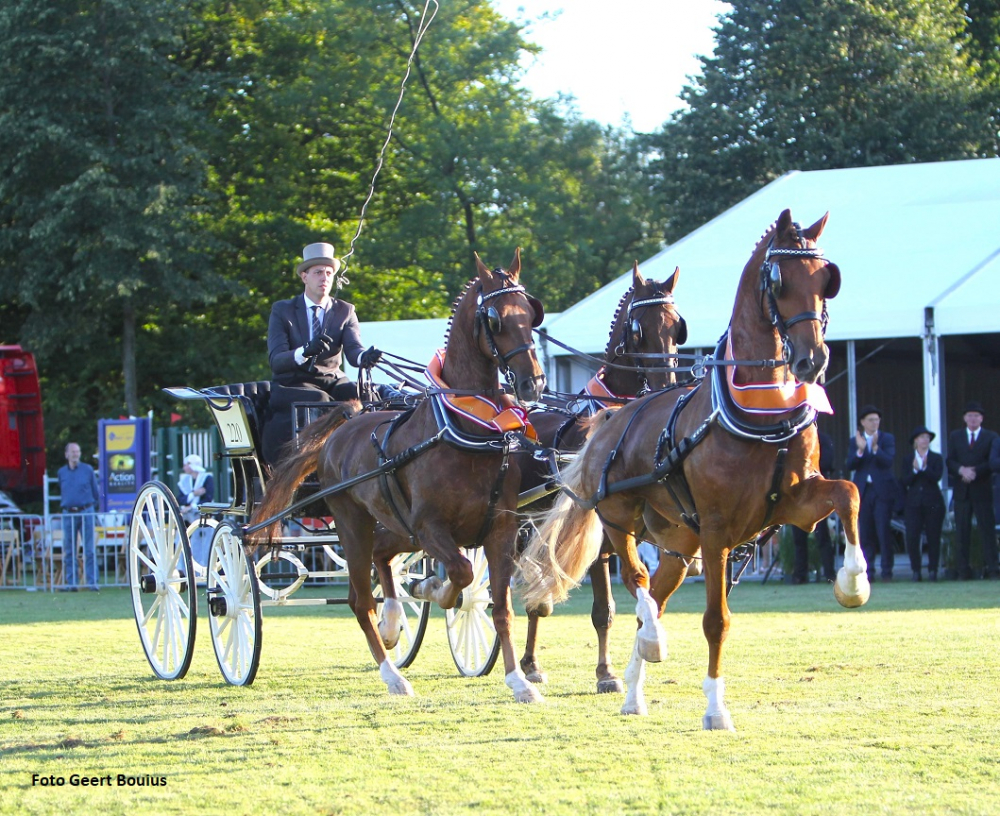 Jan Jordans heeft zijn paarden in topvorm en won de ereklasse tweespannen eerder op de middag al en mocht ook nu als voorlopig eerste weer opstellen met Haarman (v. Manno), Barend (v. Marvel) en voorpaard King (v. Fantijn). Niek Alting is altijd een kanshebber en had achter voorpaard Luitenant (v. Fantijn) een hele nieuw span lopen met de ervaren 15 jaar oude Emerson (v. Manno) en de in een meerspan debuterende 16-jarige Ditisem (v. Roy M) van Jan Muggen. Dit drietal mocht als tweede de finale in. De drie vossen voor de spider van Martien Verboord liep heel voortvarend en waren Dondroniem (v. Uromast) van stal Boonstra en zijn eigen Jonkheer (v. Eebert) en El Nino (v. Atleet) en gingen mee de finale in. Waar de achterpaarden van Jordans iets afzakten gingen die van Alting steeds beter samenwerken en met de elegante Luitenant voorop pakte Alting de titel. Jordans werd tweede en Verboord bleef derde. De aanspanningen van Mekkes, Van Laar en Veerman vielen in deze volgorde buiten de finale. Bron: De Paardenkrant
