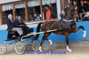 30-03-2016 | Vandaag, tweede Paasdag, organiseerde tuigpaard regio West weer haar traditionele Nieuwelingen concours in combinatie met een hengstenshow in manege Zilfia’s Hoeve van Kees en Mieke van der Maat in Houten. In drie groepen zetten tien nieuwelingen hun eerste aangespannen schreden op dit indoor concours en openden daarmee tegelijk het indoorseizoen 2016. Vanwege een aantal afzeggingen waren de rubrieken niet heel groot, maar dat maakte het wel weer overzichtelijk voor het publiek en beide juryleden Lambertus Huckriede en rising star in tuigpaard land, Mieke ter Schure. Zeven jonge paarden werden uitgenodigd voor de finale waarin er vier overbleven die nogmaals afreden voor de winst en de Gouden Zweep van Aart en Riet Visser. Als eerste reed Antoon Epskamp af met zijn charmante en zelf gefokte Hirona (Cizandro x Waterman), die in de groep al veel indruk had gemaakt . Ook nu liep de bruine merrie met veel oprichting en was bijzonder ruim in de voorhand. Robbie van Dijk volgde met groepswinnaar Hemanie W (Makari Jetsetter x Ulandro) van Etienne Raeven, een krachtig optredende vos met veel trek in de benen. Derde in de rij was Harry van Middelaar met Hianca (Crescendo HBC x Patijn) van Toon van Doorn. Deze vos heeft tuigtypische bewegingen maar zou iets luchtiger in het front mogen zijn en had zijn kruid voor de allesbeslissende fase al verschoten, want bleef nu wat vlak acteren. Dat deed de bijzonder gefokte Flip (Chri Salto Orlando x Lorton) van Piet Lijffijt niet. Deze vos groeide in de wedstrijd en ging goed vierkant over de benen en kwam mooi terug in het front. Het was al vrij snel duidelijk dat Hirona ging winnen en het talrijk aanwezige publiek wist dit ook en applaudisseerde volop waar de merrie langs kwam. Volgens jury Huckriede liep de merries er ver uit, keek er geweldig overheen en was de onbetwiste winnaar. Tweede werd sterk bewegende Hemanie W voor Flip en Hianca. De andere finalisten waren Marijke Oskam met de grote en zeker niet slechte Fendt (Manno x Orlando) van W.J. van de Biesebos, Harry van Middelaar met Hester (Victory x Stuurboord) van H. de Vries, in de finale gereden door Berry van Genugten en Lean Verhoeff met Gorzela (Manno x Exponent) van P. Leeuwis-de Wit. Naast de nieuwelingen waren er vier rubrieken voor limietpaarden. In de laagste limiet liepen Henk van Voorst met Gentle B, Tom Harrewijn met Gina Luca en Hans Robben met Flexibel over voor de hoogte prijzen en het was Van der Voorst die de eerste plek behield met de zeer gedragen bewegende Gentle. Flexibel kreeg er steeds meer zin in en maakte de passen steeds beter af en verdreef Gina Luca van de tweede plaats. Groep 2 kreeg na overkamping met drie een terechte winnaar in Diesel van Egbert Kruiswijk, altijd gereden door Berry van Genugten. Dit vosje klimt er geweldig in, treedt achter sterk onder en zet de voorhand hoog en ver weg. Daarbij is het front ook nog fraai. Sterk tweede werd Willem van de Gugten met Fantast, ook een heel best bewegend tuigpaard dat goed doorging maar in uitstraling toegaf op de winnaar. Met Grandioos werd Antoon Epskamp derde. De volgende groep telde drie deelnemers en het was Harry van Middelaar die met Gardenia HBC regelrecht naar de winst liep. Front, kracht en actie is het handelsmerk van de schimmel. Marcel van Bruggen werd met de deftige Dellorto tweede voor Brian Franken met Ewout BFT. De laatste groep kenmerkte zich in een tweestrijd tussen Hans Robben met Aron en Piet Lijffijt jr. met Drukwerk. Aron lijkt per wedstrijd beter te worden en presenteerde zich nu heel deftig en fier en ging rondom hoog van de vloer. Met de hals er hoog op ging de winst naar Aron voor Drukwerk die over de benen goed mee kon, maar in het front te kort kwam. Tussen de bedrijven door kwamen tuigpaard hengsten Hertog Jan, Dylano, Crescendo HBC, Unieko en Stuurboord zich presenteren als ook de hackneyhengsten Big Star en Sir Arie. Bijzonder als altijd was de presentatie van de nu 22-jarige Manno himself. Aan de hand van Kees van der Maat en zijn grooms dartelde deze Johan Cruijff onder de tuigpaarden nog door de bak en er lijkt geen sleet op te zitten!