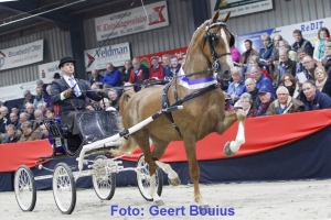 Voor de merriefinale werden vijf paarden uitgenodigd, er verschenen echter maar drie in de baan. Henk Hammers had in Hulony-C (v. Cizandro) van Brian Franken, winnares van de eerste groep, een bijzonder aansprekende merrie voor de wagen, die met veel schwung door de baan ging. Veel front, een goed achterbeen en voldoende ruimte in de voorhand kenmerkten haar optreden. In groep twee had Hianca (v. Crescendo) van Toon van Doorn haar visitekaartje al afgegeven in handen van Harry van Middelaar en was daarin de duidelijke winnaar. Hirona (v. Cizandro) kennen we al van Houten en Ambt Delden en ze wist de derde groep te winnen. De donkerbruine merrie loopt echt bergopwaarts met een mooie hals erop en maakte ruime passen. In de finale maakte Hianca zich nog groter en zette de hals er geweldig op. Ze is na elke indoor wedstrijd gegroeid en liep nu haar beste wedstrijd met een hoog en ruim voorbeengebruik en sterke achterhand. Parmantig en zonder fouten kon Harry de vosmerrie als eerste opstellen in deze strijd om de beste nieuweling bij de merries. Hulony was zeker niet slecht in de finale, maar had even minder uitstraling dan de winnares en werd verdiend tweede voor Hirona. He-Roos (v. Crescendo) van Fokkelien Oldenburger en Heidelien (v. Cizandro)van de gebroeders Den Otter waren de geselecteerde finalisten die de finale lieten schieten…