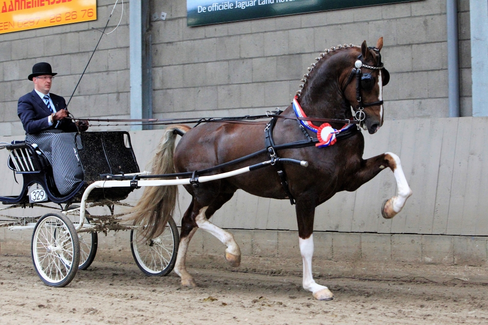 Tweede Paasdag, 2 april, was in Manege Zilfia’s Hoeve te Houten te jaarlijkse Nieuwelingen dag en hengstenshow georganiseerd door de tuigpaardafdeling van KWPN-regio West. Elk jaar weer trekt deze eerste wedstrijd voor de jonge nieuwe tuigpaarden veel publiek en ook dit jaar stonde ze weer rijen dik langs de lange binnenbak. Uit vijf groepen nieuwelingen werden door de juryleden Leendert Veerman en Demi van Nispen zes zeer getalenteerde paarden geselecteerd voor de finale aan het eind van de middag. Harry van Middelaar had twee ijzers in het vuur; zelf reed hij de ruim bewegende Jennytou van’t Hooge (v. Delviro) van Henk Minkema en Berry van de Genugten was gastrijder achter de veel front makende en frank en vrij lopende Jonas GSM (v. Unieko) van de gebroeders Seinen. Wilco van de Wijngaard heeft in de grote en makkelijk lopende Iglesias (v. Waldemar) een hele mooie vos die van nature een mooi front heeft. De elite vosmerrie Jaantje (v. Cizandro) van de gebroeders Den Otter was het meest deftig en maakte zich heel groot. Over de benen was ze heel zuiver en vierkant, alleen in de finale werd ze iets voorzichtig gereden door Robbie van Dijk. De vorig jaar aangewezen hengst Julius van Hapert (v. Cizandro) werd door zijn fokker en eigenaar Hans Castelijns naar de finale gereden, maar bleef daarna op de wagen. Het meest spectaculair was de door Marcel Ritsma voorgestelde Jaguar (v. Eebert) van Hans Robben. Een vos met veel vermogen die in de voorronde soms iets de diep ging en er een paar keer uit was. Zesde finalist was Jakarta ARW (v. Ditisem) van Adriaan Veerman gereden door Henk Hammers. Een zilverappel vos die voor en achter goed van de grond ging. Er was op voorhand niet een uitgesproken favoriet voor de eindoverwinning en dus was het spannend. Ritsma kon bij Jaguar het front er veel beter ophouden waardoor het plaatje veel mooier en imponerend werd. De balans bleek zo nu en dan nog wel lastig maar dat werd hem vergeven omdat de goede momenten de overhand hadden en hij dan echt super hoog en ruim door de bak marcheerde. Samen met Jennytou van’t Hooge en Jakarta ging Jaguar de allesbeslissende eindstrijd in en wist die uiteindelijke winnend af te sluiten. De zwarte Jennytou mistte nu wat oprichting en dat ging ten kostte van de beweging en daardoor zakte zij een plaatsje en werd derde achter Jakarta die heel constant en met oprichting bleef lopen. Echter, tegen Jaguar kon niemand op. Jaantje mistte wat tempo maar ging wel heel mooi gedragen rond, zij werd vierde voor de ook zeker niet slecht acterende Jonas GSM. Iglesias eindigde als zesde en dat was geen schande in dit veld talentvolle nieuwelingen! Marcel Ritsma won niet alleen de wedstrijd maar kreeg ook de bijbehorende Gouden Zweep opgespeld.
