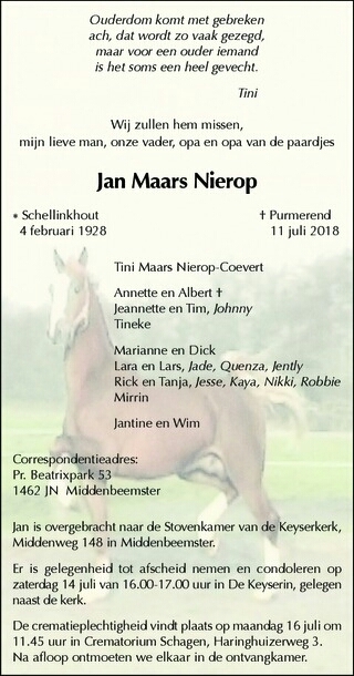 Vandaag kregen we het bericht dat dhr. J. Maars Nierop overleden is.