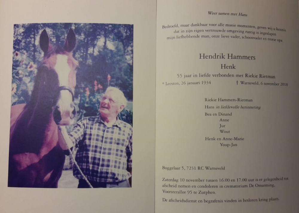 Onlangs kregen we het bericht dat Dhr. Hammers uit Warnsveld is overleden.