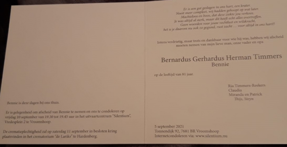 Vandaag ontvingen wij het bericht dat Dhr. Bennie Timmers is overleden.