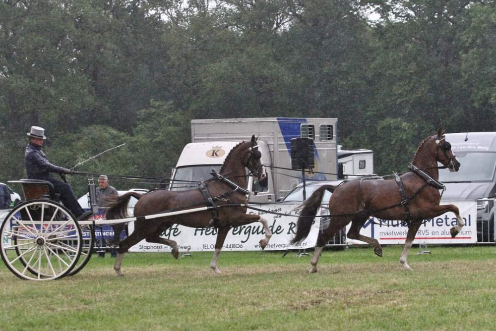 Derk Jan Mekkes met Roelofsen Horsetrucks Hugo (v. Patijn) en Roelofsen Horsetrucks Jefferson (v. Eebert) werden tijdens de eerste wedstrijd in De Wijk fraai derde.