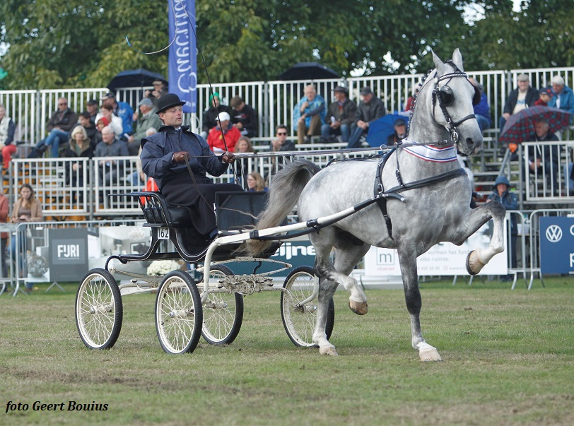 De finale van de nieuwelingen competitie van regio Midden was afgelopen zaterdag in Hoogland. Zes competitie paarden reden af in deze laatste en finale wedstrijd. Mark de Groot was al winnaar maar wilde nog wel even revanche nemen op de vierde plaats een week geleden in Luttenberg. De hengst Nevaro (v. Idol) van Leo Wijkmans liet tijdens het overrijden met drie nogmaals zien waarom hij de beste was. De schimmelhengst liep een foutloze wedstrijd en klom er mooi in met een sterk achterbeen en hoog en ruim voorbeengebruik. De hals staat er mooi op en hij pakte dan ook vrij gemakkelijk de dagwinst. Met de volle buit van 40 punten was hij de overtuigende overall winnaar. Een paard dat dit seizoen veel progressie boekte in de vosmerrie Nadia (v. Fantijn) van mevrouw G.W. Zuidema – Van Dam en gereden door Sebastiaan Ardesch. Nadia legt veel actie in haar bewegingen maar zou nog iets meer door het lichaam mogen lopen. De jury zette haar op de tweede plek en dat ging ten koste van Freek Saris met Mr. Bleu Sky (v. Idol) van Brian Franken. Een heel mooie verschijning met een prachtig natuurlijk front. In de finale werd het voorbeen gebruik iets minder waardoor het een derde plaats werd. In de eindstand werden ze wel tweede met 37 punten. Derde in de eindstand werd Joelle Berghuis met Mary-Rose MJDB (v. Delviro HBC) van Marten Joris de Boer. Ze werd vierde in de wedstijd en behaalde 33 punten. Nadia eindigde met 29 punten als vierde, Miss Colinda (v. Waterman) met Gijs ter Laak werd met 28 punten vijfde en met 19 punten werd Adrie van Ingen met Nikita (v. Fabuleus) zesde. Bron: De Paardenkrant.