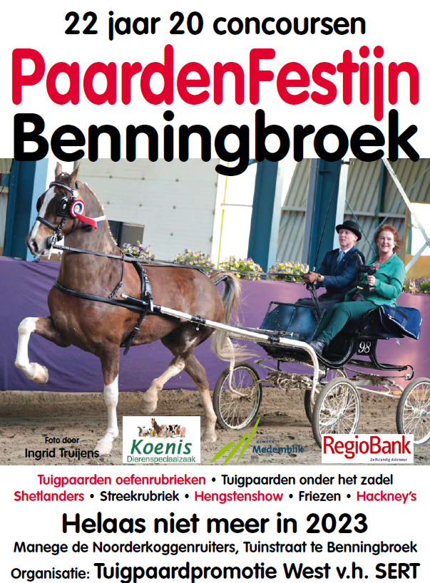 Wij willen het bestuur dan ook zeer hartelijk danken voor de door hen geboden gelegenheid om onze geweldig mooie sport in Benningbroek te laten verrijden en op die manier de jonge paarden te kunnen laten wennen aan de impact van een concours. Wij willen hierbij ook de vele sponsoren , vrijwilligers en deelnemers bedanken voor alle deelname in de afgelopen jaren. U begrijpt dat zonder hun deelname geen concours mogelijk was geweest.