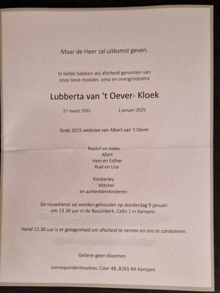 Ons bereikte het bericht dat Mw van 't Oever is overleden.