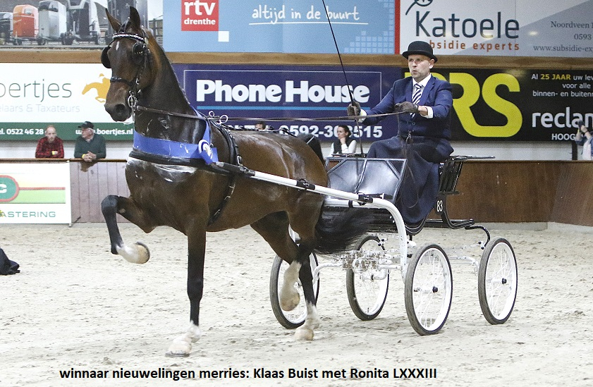 In de eerste groep merries wist Henri van Weeghel de concurrentie af te troeven met de fraaie Rumalya (v. Just Lucky), die veel zweefmoment in haar optreden had en foutloos liep. Een eigen fokproduct net als de tweede geplaatste Klaas Buist met Ronita LXXXIII. Een grote donkerbruine merrie van Cizandro met de hals er boven op en veel actie in de benen. Beide mochten naar de finale. In groep twee streden Mark de Groot en Albert Lueks om de winst maar waren al geplaats voor de finale. Mark had de veel bodem pakkende Rigoletto (v. Leffe Blond), ook zelf gefokt, voor de wagen en Albert presenteerde de deftige door G. Kamphort gefokte Radora (v. Cizandro) van D. Noordhuis en Lieke Lueks. De powervolle Rigoletto won.